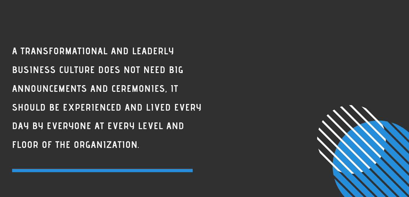 A great culture is cultivated by the daily actions of its leaders not by slogans,speeches and colourful statements hanged on the walls. Employees, customers and suppliers have the natural ability to smell, see and taste a great culture in their daily interaction with the organisation.